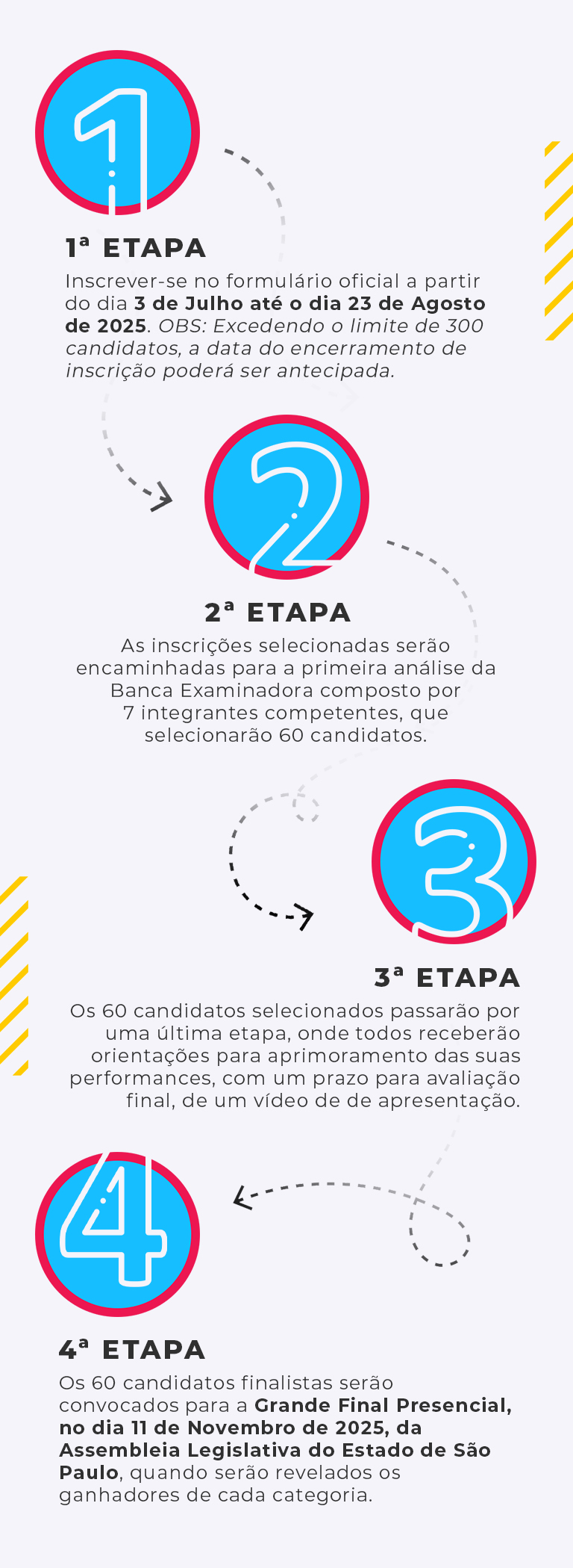 Os 60 candidatos finalistas serão convocados para a grande final presencial, dia 11 de Novembro de 2025, da Assembleia Legislativa do Estado de São Paulo, quando serão revelados os ganhadores de cada categoria.